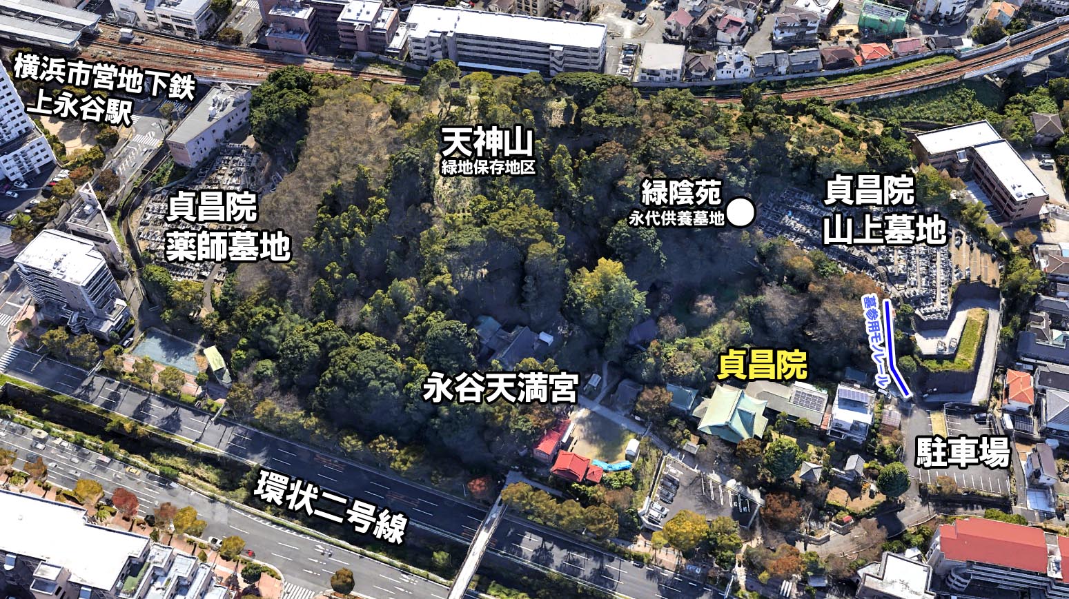 『新編相模風土記』によれば「昔、天神神職、伊予というもの居住せし跡なれば此の称ありと云う」とあり、「永谷郷に居城し霊夢のお告げによって永谷天満宮を造営した」という藤原乗国(宅間藤原規富)の城跡はここ「伊予殿根」であると『日本城郭体系』では推測しています。そして乗国の子、憲方が伊予を名乗ったため、「伊予殿根」の地名が起ったと考えられます。 時代は下り、足利時代に一時廃絶された天性院を再建するにあたり、天正10年、川上(戸塚区川上町)徳翁寺の第四世住職 明堂文龍大和尚を請し、上永谷町字籠森(かごもり=現在の上永谷駅付近)に寺院が建立されました。これが曹洞宗としての貞昌院の始まりです。以降、貞昌院が永谷天満宮の別当寺院(住職が神主を兼ねる)となりました。 |
