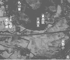 左は平成2年の写真。市営地下鉄の上永谷駅が開設 されてから急速に宅地開発が進みました。Kaminagaya is the hilly part locating NW of Kounan Ward,YOKOHAMA,you will see Kaminagaya was heavily wooded and covered with rice fields from the right bird view-phot in 1947, recently undergone large-scale housing development and construction of Kaminagaya Station on the Munincipal Subway. 航空写真と歴史書でつづる上永谷の歴史 (さらに詳しい歴史について)