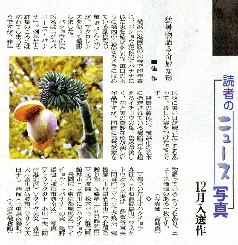 読売新聞「読者のニュース写真」12月号に、境内のバショウ(ジャパニーズバナナ)を撮影した写真が掲載されました。