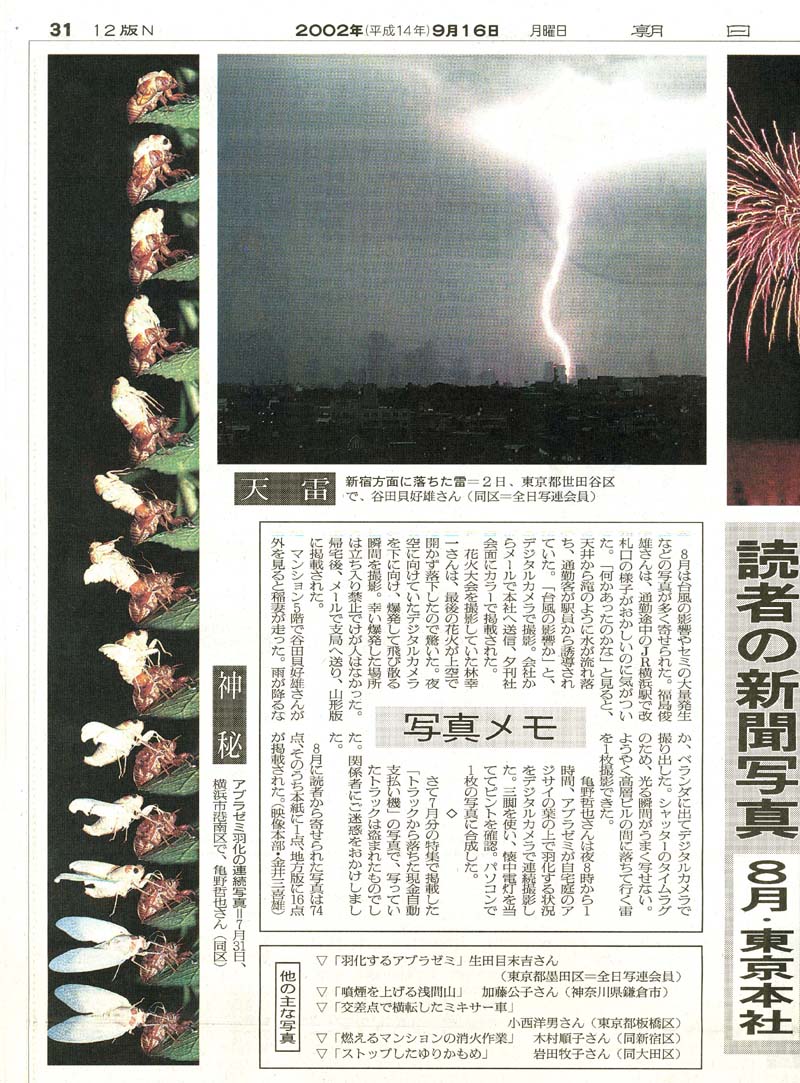 朝日新聞「読者の新聞写真」8月号に、セミの羽化の写真が掲載されました。
