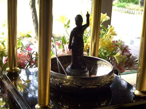 誕生の姿を模した仏像は天地を指しており「天上天下唯我独尊」を表します。 この仏像の周りを花々で飾り付けて本堂に安置し、その像に甘茶をかけてお釈迦様の誕生を祝福するのが花祭りなのです。