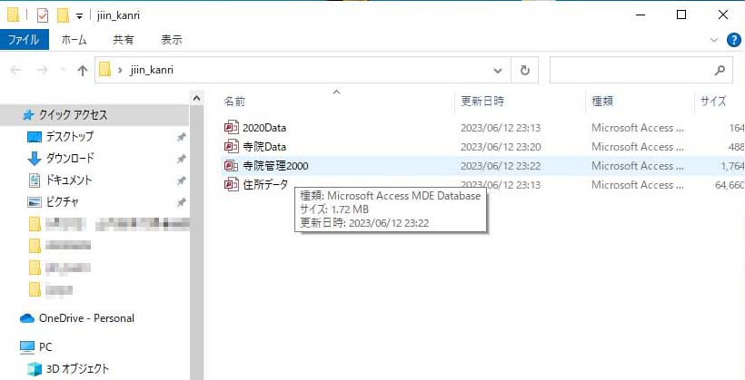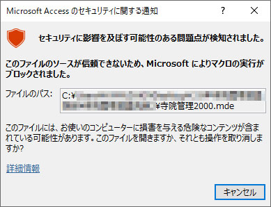 これで、寺院管理ソフトが起動するはずですので、寺院管理2000.mdeをクリックして起動してみてください。