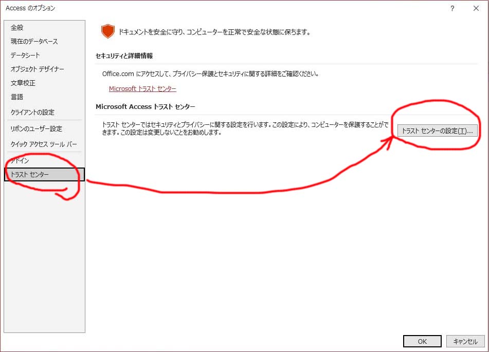 左下の「トラストセンター」 →「トラストセンターの設定」をクリック。