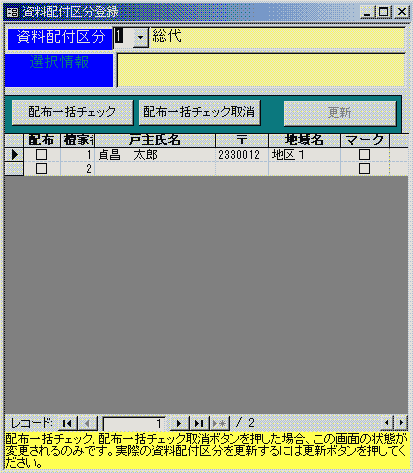 (1)資料配布区分 ⇒ 初期設定の項目が、ここに反映されていますので、ここで選択して下さい。 (2)檀信徒一覧が表示されますので、地区名を参考に、「配布」の項目に一括してチェックしたりチェックを外したりできます。 (3)「更新」ボタンを押すことで、設定が記録されます。(上記黄色の注意書きを参照ください)