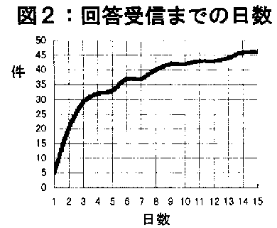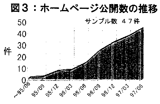 回答受信までに要した日数は、送信から2日間で62%、1週間で85%であった。(図2)①「ホームページの公開時期(図3)」 回答中、最初に公開されたホームページ(正確にはウエブページ)は平成7年5月であった。その後、インターネットが身近になるきっかけとなったWindows95の発売(平成7年秋)を境に、翌年からサイトの数が急増している。それ以降増加のペースはほぼ一定となっている。