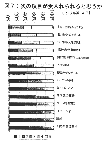 「祈祷・祈願」「読経」については、あくまでも現実の僧侶が目の前で行うもので、コンピュータから流れる「お経」は意味をもたないとの回答であった。⑦ インターネットの利点・欠点
