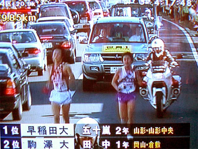 「2区」集団を抜け出したのは山梨学院のモカンバ。私が応援した地点でもトップで通過、そのままトップで襷を繋いだ。早稲田は大健闘、僅か10秒差2位で襷を繋ぐ。亜細亜、順大、中央の順。法政・徳本が足を故障し、7キロ過ぎで涙の棄権。駒大・神屋は本来の走りが見られず9位。