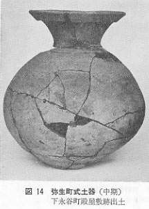 横浜市内で弥生式土器が認められるようになるのは、中期の宮の台式あたりからで、近隣では大岡川流域の港南区笹下町横浜刑務所西方、同笹下町大久保、南区六ツ川町123番地付近や、柏尾川流域などに分布がみられます。(横浜市史第一巻)