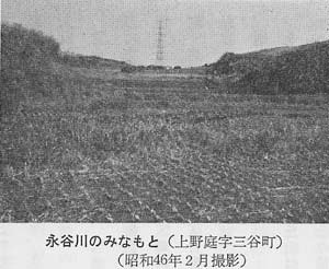「注」馬洗川、永谷川共に四時、清流、幾多の小魚が右往左往し、其の姿が手に取るように見えたもの、殊に夏季には此の川一帯に螢飛び交い、遠近に、螢呼ぶゆかた姿の児女の群が、散在す。