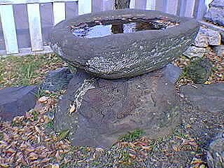 社殿正面の階段の上り口にあります。御神木の杉の樹(落雷で伐採)はここの付近にありました。