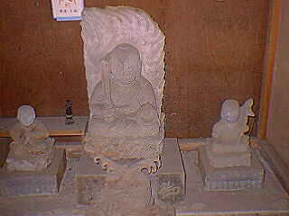 般若寺本堂の左側にあります。双体男女の道祖神で、なかよく肩を組んでいます。女性は妊娠していると言われていますが、 顔は欠損してしまい、セメントで修復されています。明和5年造立