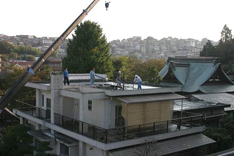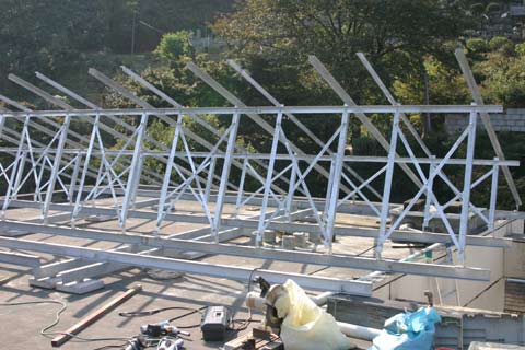 ![]() 前日の雨がうそのように晴れました。 朝から工事開始、予め加工してあった架台鋼材を一気に搬入します。 |