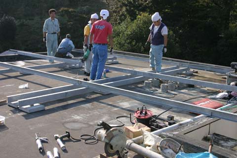 架台ベースの組立て。 強風のときに架台が動かないように鋼材両端を屋上パラペットに固定します。 |