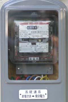 (右)新たに設置された買電用メーター。 2003年11月4日に東京電力の系統検査。 設置工事は(株)スカイテック横須賀支店にお世話になりました。 |