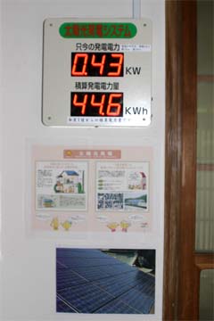 ![]() ![]() (左上)インバータ。発電された直流を交流に変換します。 (左下)発電量表示装置コントローラ部。客間に設置された表示装置に発電量データを送ります。 (右)客間入口にある発電量表示装置です。 |
