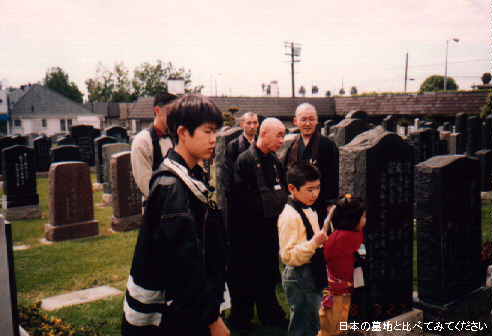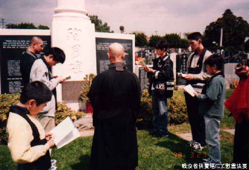 エバーグリーンの日系墓地には、一面芝生が植えられており、そこに整然と平板の墓石が並んでいる光景が見られます。中心にある戦没者慰霊塔において、午前中の研修の締めくくりとして一同による慰霊法要が営まれました。第二次世界大戦により、祖国と敵対することとなり、日本人は数年間、強制収容所へと収監されることとなりました。ロスアンゼルスの地でも、数多くの戦争による犠牲者があったのです。Picture Picture